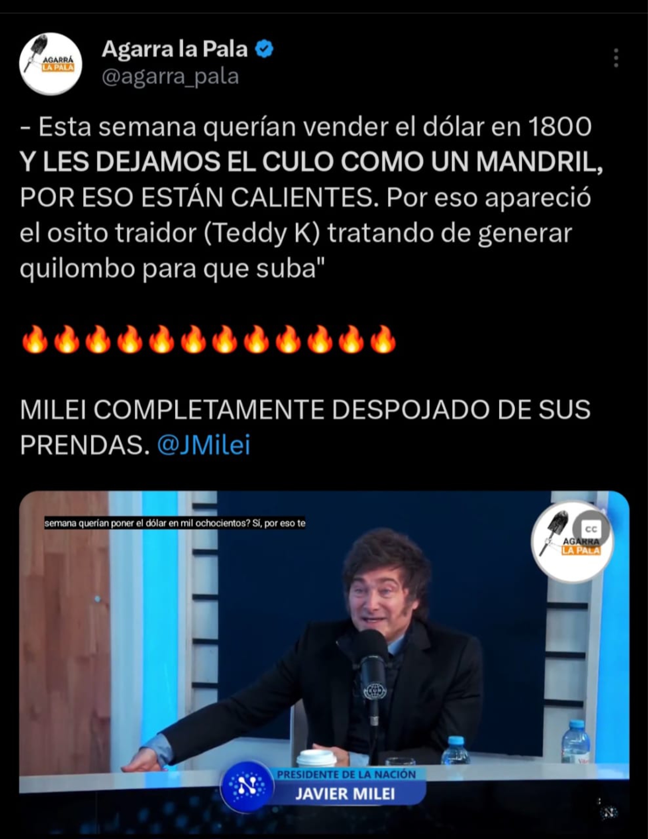 El post incluye un video de Milei entrevistado por el conductor Alejandro Fantino donde aquel repite la misma frase. Nótese aquí el uso de las mayúsculas, que en internet implica levantar la voz.